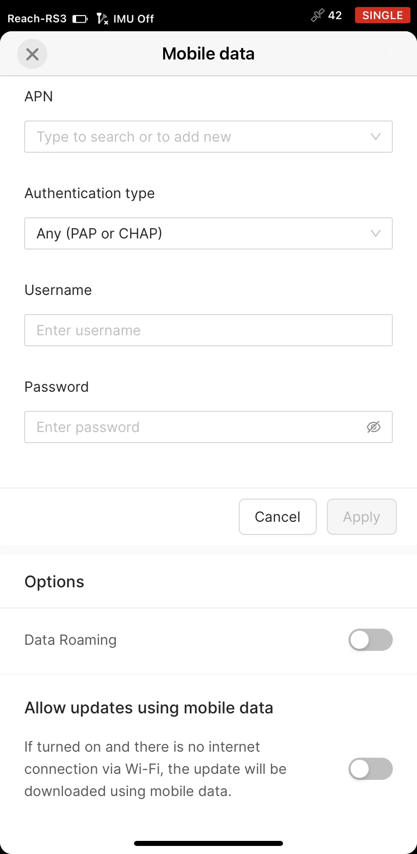 Questa guida mostra come connettere Reach a Internet tramite modem cellulare integrato per ottenere correzioni dal tuo servizio NTRIP.