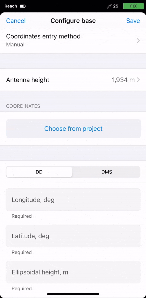 Inserisci le coordinate geografiche del tuo punto in formato DD o DMS oppure importa un punto dal tuo progetto Emlid toccando Choose from project.