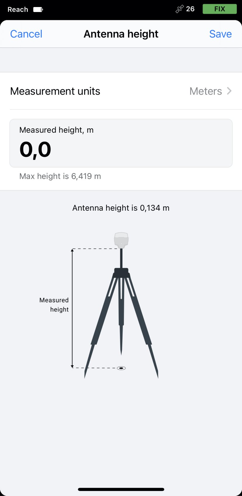 Quando posizioni la tua Base Reach sul campo, assicurati che il dispositivo GNSS Reach sia posizionato esattamente sopra il punto contrassegnato sul treppiede e livellato. Quando si impostano manualmente le coordinate di base, è necessario misurare l'offset dell'altezza dell'antenna. Seguire i passaggi seguenti: