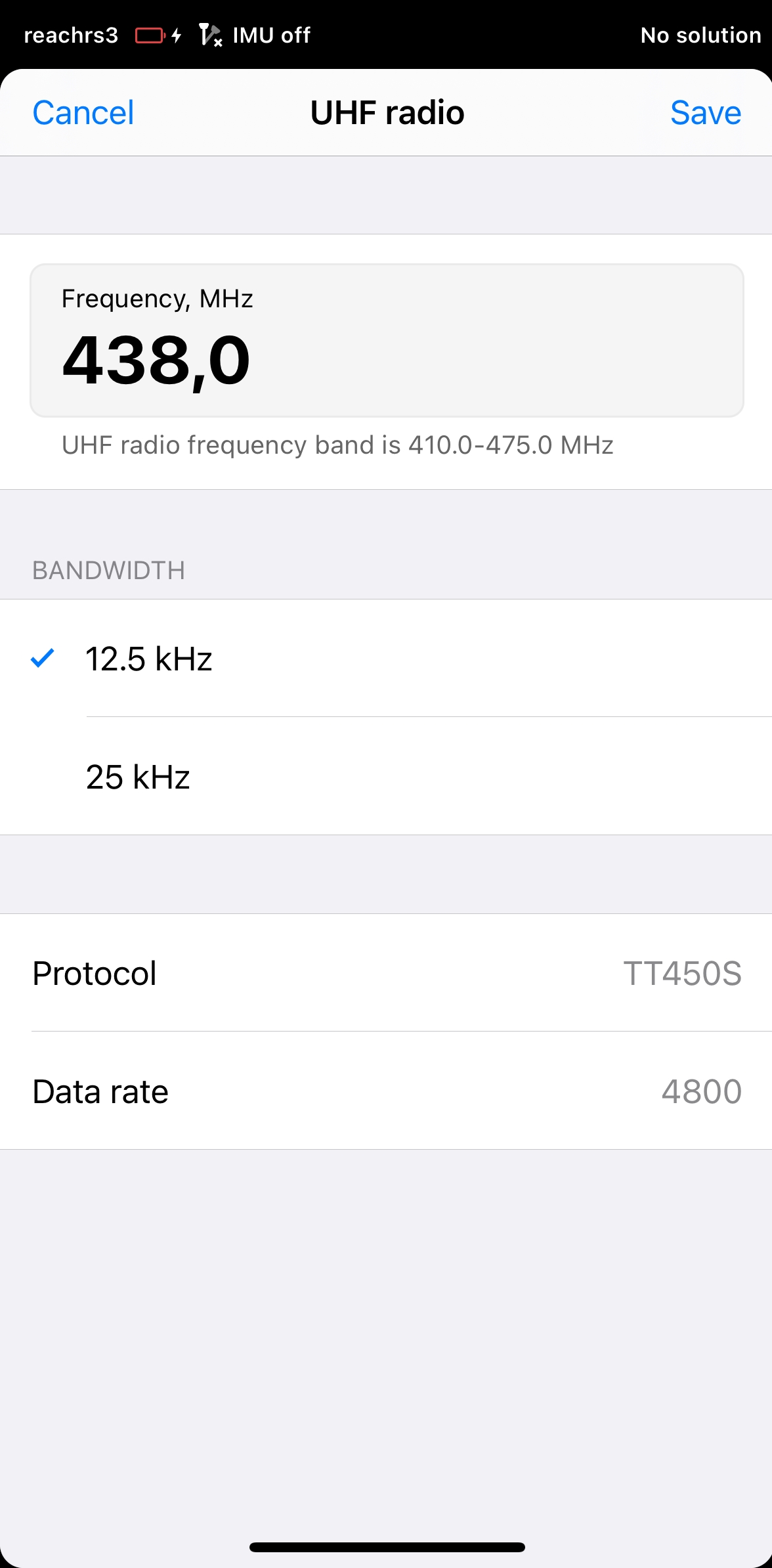Nella casella UHF , tocca il pulsante Edit. Imposta la stessa frequenza e larghezza di banda della Base. La velocità dei dati cambierà automaticamente a seconda della larghezza di banda scelta: per 25kHz è 9600 bit/s, per 12,5—4800 bit/s. Tocca su Save.